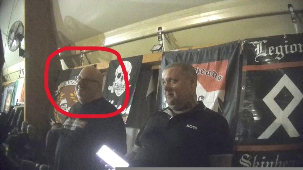 A magyar hammerskins Papp Zoltán (előtérben), Szlavecz Krisztián (Papp mögött balra) és Mészei Imre (Papptól jobbra) a 2025-ös olaszországi „Hammerfest” bejáratánál.